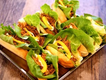 Světlá bageta se zeleninou a trhaným vepřovým masem - specialita