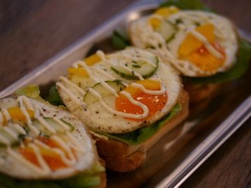 2 plátky toustového chleba se sýrem, zeleninou, vejcem a snítkem tymiánu. Rychlá a výživná svačina skvěle zasytí nebo uspokojí, když máte chuť na něco dobrého.